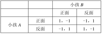 在掷硬币模型中,如果小孩A,B策略组合为(正面,反面),那么小孩A的支付为-1,小孩B的支付为1,小孩A,B的支付组合为(-1,1);如果小孩A,B的策略组合为(正面,正面),那么小孩A的支付为1,小孩B的支付为-1,小孩A,B的支付组合为(1,-1)。