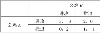 在斗鸡博弈中,参与人即公鸡A和公鸡B,两者的策略空间都是{进攻,撤退},支付函数见表中两个参与人在不同策略下的数字所示。