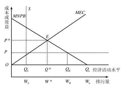 图14-3横坐标Q表示某钢铁厂的经济活动水平,W表示某钢铁厂在生产化工产品中污染物的排放量。纵坐标表示污染造成的边际成本或降低污染给社会带来的边际收益。MEC代表边际外部成本。MNPB代表边际私人净效益。政府管制机构必须根据最优污染程度来确定最优污染标准。MNPB的边际收益曲线与MEC边际外部成本曲线的交点E是最优污染点。E点之右,污染程度较严重,污染所造成的边际社会成本大于边际收益,只要降低污染就有利。因此,排污者只要超过了排污标准,政府将处以高额罚款。污染者的经济活动就尽量不超过这一点,非最优的外部效应就消除了,达到帕累托改进。