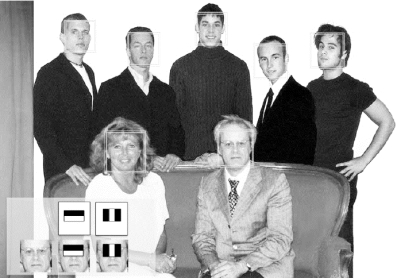 当时计算机视觉的工作还都停留在简单样本的阶段,或是通常样本量较少,不能输出在现实世界可以利用的信息。到了90年代,计算机视觉领域不再局限于形状,逐渐涉及感知分组的研究领域,即将一张图片中的像素点归类到有意义的区域。即使可能不知道这些像素点组合到一起是什么,但是可以将属于同一个物体的像素点从背景中提取出来,这个过程就叫作图像分割。当时的一种代表性做法是使用图算法对图像进行分割。1999—2000年,机器学习技术,特别是统计学习方法开始加速发展,出现了一些新方法,如支持向量机模型、boosting方法、图模型。2001年,Paul Viola和Michael Jones使用AdaBoost算法进行了实时面部检测,检测结果如图1-18所示。在他们发表论文后的第五年,作为从基础科学研究到实际应用的一个快速转化,富士公司推出了第一个能够实现实时面部检测的数码相机。