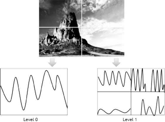 在这段时间内,计算机视觉的另一进展是识别整幅图的场景,其中的代表性算法是空间金字塔匹配。其背后的思想是,图片中有各种特征,这些特征可以反映图片中的是哪种场景,这个算法从图片的各个部分各像素抽取特征,并将它们放在一起作为一个特征描述符,然后一般在特征描述符的基础上进行支持向量机等操作。如图1-20所示,将图像分为不同层次的块,分别统计它们的直方图,将每个层次的直方图串联起来并赋予权重,输入支持向量机中进行训练和预测。