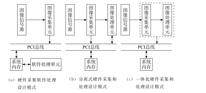 在图像采集处理系统中,系统设计通常遵循三种设计模式:硬件采集软件处理模式、分离式硬件采集和处理设计模式以及一体化硬件采集和处理设计模式。如图3-2所示,三种方案具有各自的特点,适用于不同场合。