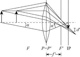 物方远心镜头的光路如图3-18所示。图中将主平面P 与P′简化重合,并在像方焦点处设置了孔径光阑。从主光线可以看出,两个物距不同但大小相同的被测物成像在相同位置,也就是有相同的放大率。与普通镜头一样,不在焦平面上的物点在像面上会产生弥散斑。