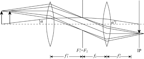 双侧远心镜头结合了物方远心和像方远心的特点,在物方远心镜头孔径光阑后面再加上像方远心镜头系统,使第一个镜头的像方焦点F′1与第二个镜头的物方焦点F 2重合,如图3-19所示。根据成像定律可以得出第一个镜头将入瞳移到了无穷远,第二个镜头将出瞳也移到了无穷远,因此也称作双远心镜头。其特点是物体离的远近或相机离的远近都不影响放大倍数,所以被广泛应用在机器视觉检测领域。
