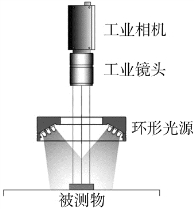 环形光源指在一个环形面内均匀排布在被测物周围的光源。其特点是可以为被检测物体提供大面积且均匀的照明,在实际应用于机器视觉系统时,环形光源一般会与CCD镜头同轴安放。当与被检测物体距离合适时,环形光源可以使阴影大大减少,增加被测物体的对比度,实现大面积的照明。环形光源的缺点是,当与被测物体距离不合适时,会存在环形反光的现象。因此,在选用环形光源时,应特别注意其与被测物体间的距离。图3-26为环形光源照明的示意图。