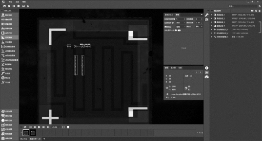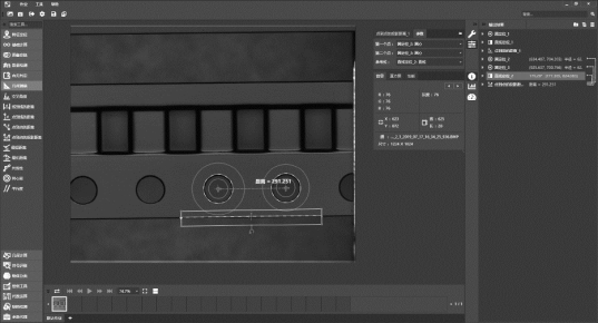 图5-8为芯片内部角点距离检测,图5-9为半导体孔位中心点之间的距离检测,在要求仅为点到点之间时,芯片角点距离利用点到点之间的距离测量即可。而对于精度要求极高的电子半导体之间的孔位点与边缘直线之间存在框架关系时,利用点到点的投影距离测量更佳。