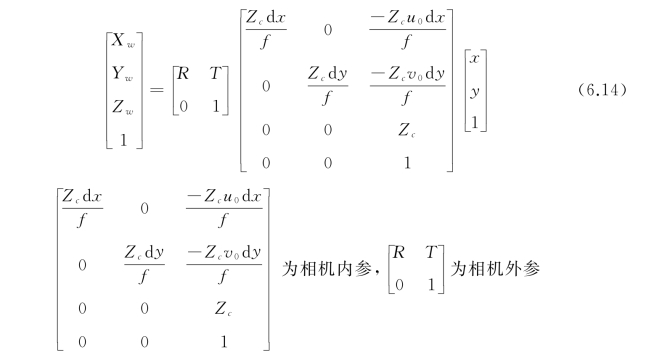 上述的推导已经完成了图像各个坐标系之间的相互转换,进一步可以获得像素坐标系到世界坐标系的转换关系: