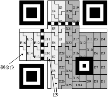 ⑤构造矩阵:将探测图形、分隔符、定位图形、校正图形和码字模块放入矩阵中,把上面的完整序列填充到相应规格的二维码矩阵区域中,如图8-4所示。