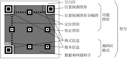 如图8-3所示,二维码中的符号包括功能图形和编码区格式信息。功能图形包括空白区、位置探测图形、位置探测图形分隔符、定位图形和校正图形。其中,定位图形用于对二维码的定位,对每个QR码来说,位置都是固定存在的,只是大小规格会有所差异;校正图形的规格一旦确定,校正图形的数量和位置也就确定了。