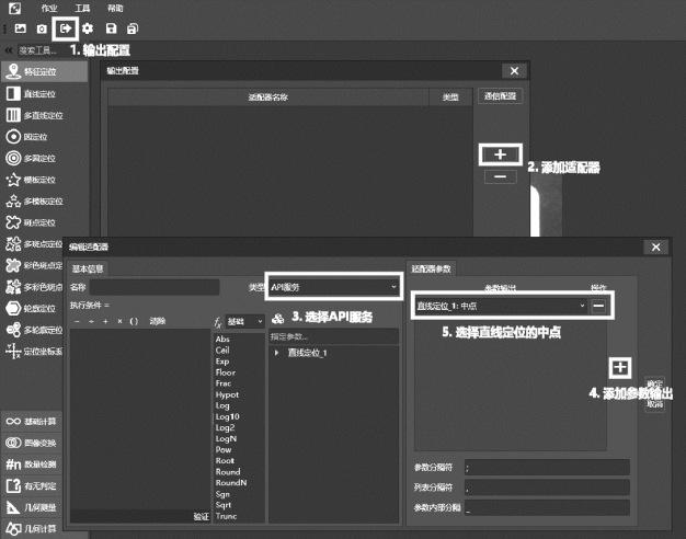 操作步骤如图9-5所示:输出配置→添加适配器→选择API服务→选择算法结果(以上述操作中选择的直线定位算法的中点坐标为例)→添加参数输出。