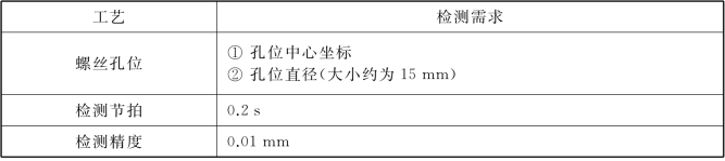 将图像坐标系与运动控制坐标系进行标定,在运动控制系统移动的过程中,视觉系统能够精准定位螺丝孔中心,并把唯一对应的物理坐标发送给运动控制系统,后者完成打螺丝的动作,主要的检测指标要求见表11-1。