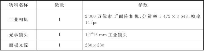 根据客户方的检测需求,设计了电表铅封豆检测系统的技术方案,旨在让合作方充分了解所提出的电表铅封豆检测系统的技术方案细节,为适应检测需求,选择面板光源。方案由一个2 000万像素的面阵相机,一个16 mm镜头及一个面板光源组成。表13-1为方案配置清单。