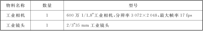检测系统的视觉部分主要有工业面阵相机、镜头、配件、图像处理软件等。根据实际物体的视野以及物体测量要求,选用合适的工业相机、镜头和附件配合采集图像,并将采集到的图片用软件进行处理。具体物料清单见表15-2。