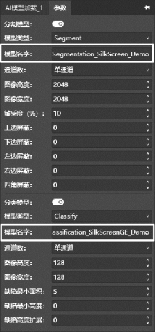 将分割分类模型分别放入灵闪根目录下的model文件夹下的segment和classify文件夹中。点击左侧AI模型加载,在图16-11右侧参数栏中分别填写分割和分类模型的名字。图16-11为具体的参数配置。