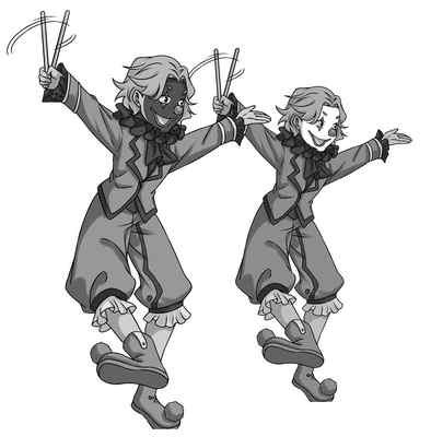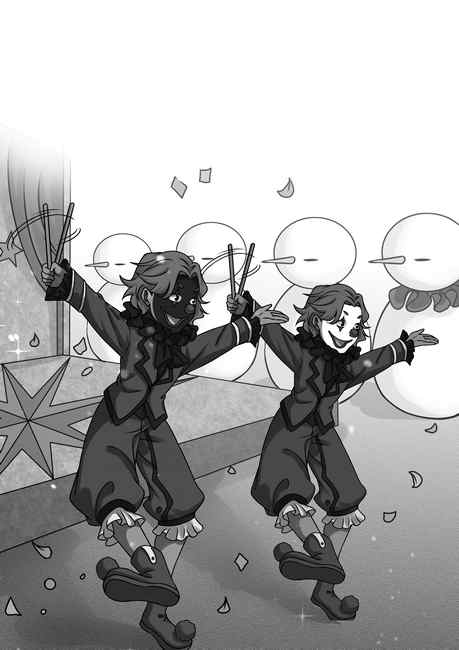 白脸小丑和黑脸小丑挥着水晶棒,迈着滑稽的步伐,走了过来。他们的步子滑稽,却又整齐划一,看起来就像被机器操控着。