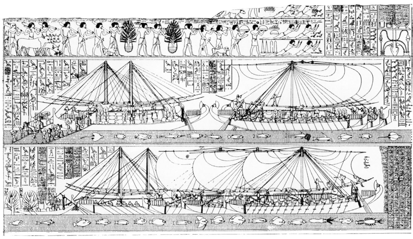 古埃及的海船,不是纸莎草船,而是木船。前些年,埃及考古工作者和欧洲古船专家根据此壁画和出土船木、绳索等线索,复原了一艘与壁画一样的红海古帆船。英国BBC电视台还为此拍了一部纪录片。