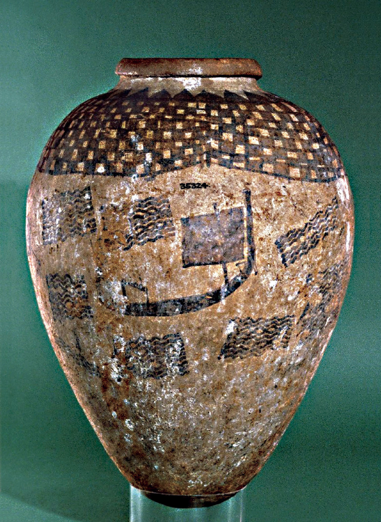 格尔塞陶罐,高18英寸(约46厘米),约制作于公元前3500年,绘有河流纹饰和一艘清晰的单桅方帆船,船尾还有作用尚不清楚的类似船舱的构件