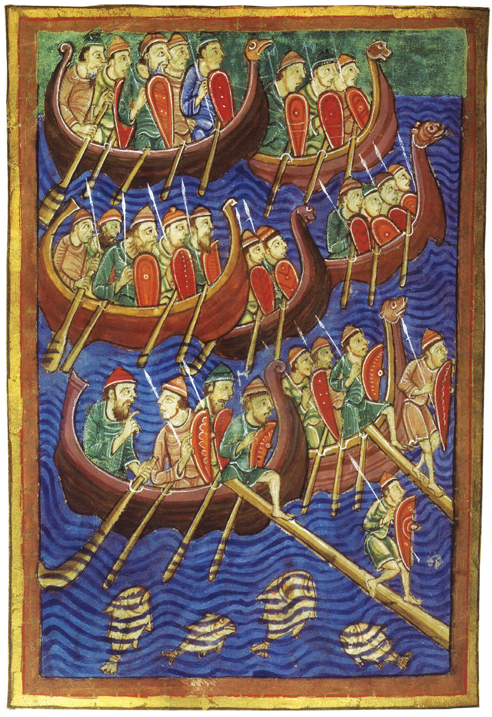 《盎格鲁-撒克逊编年史》中表现丹麦海盗“无骨者”伊瓦尔在英格兰登陆场面的插画