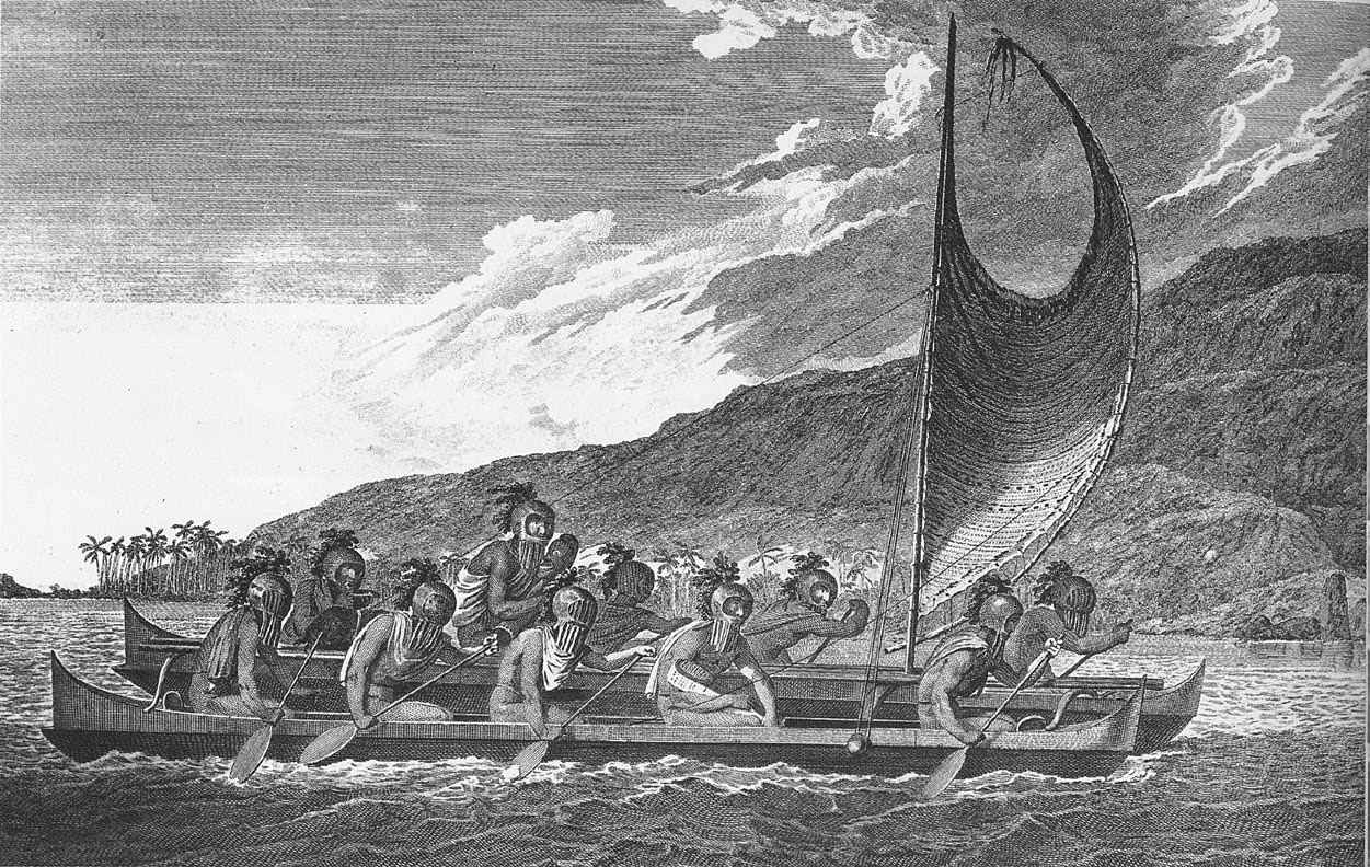 1781年欧洲版画中有着叉形帆的波利尼西亚双体独木舟