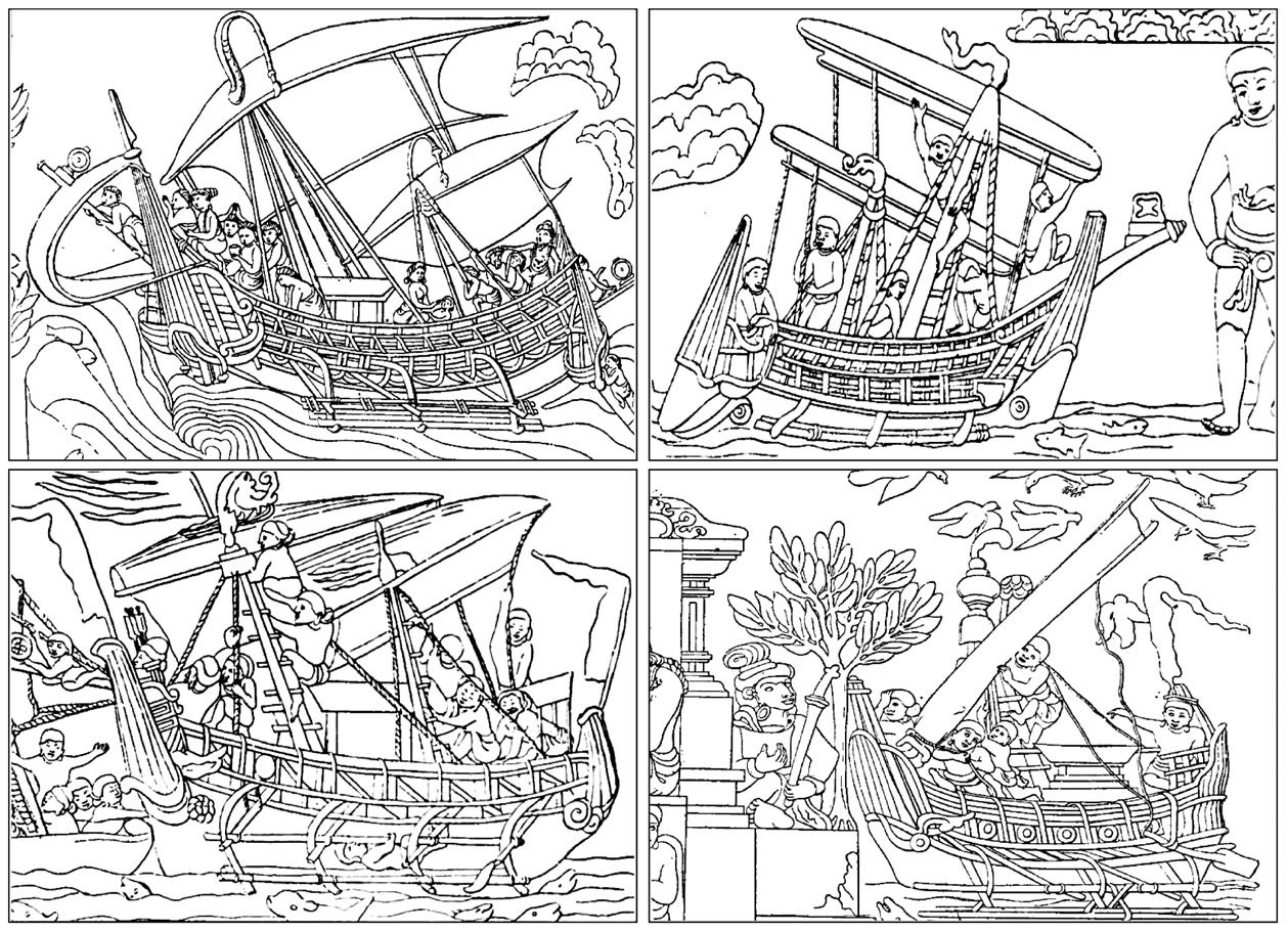 婆罗浮屠浮雕中的7幅帆船,有5艘带有舷外浮架,另外2艘小一些的船则没有浮架。5艘带有舷外浮架的船都是双浮架帆船,有两个“人字桅”,亦称“双脚桅”,为主桅,挂方形帆,船首有一根斜桅挂方形帆。主桅与后桅上有特殊的方形斜帆(亦称斜桁四角帆)。船有多层甲板,主甲板上部建筑为斜顶。这种东南亚帆船被后世称为“螃蟹船”。婆罗浮屠中的“海商本生”故事表现的是,希鲁在沙暴到来之前得到警示,乘船来到有孔雀徜徉的幸福海岸,他搭乘的船安有舷外双浮架。另一幅“海商本生”表现的是迈特拉坎雅卡追寻父亲海上经商脚步的故事,雕刻展示的是一场船难,画中的大船正在收帆,水手们已转移到小船上,一侧浮架上有水手似在掌握船的平衡。这些婆罗浮屠帆船浮雕虽然雕刻的是“海商本生”故事,却精细地表现了8世纪的爪哇帆船,它是这个时期唯一幸存的东亚海上帆船历史图像。