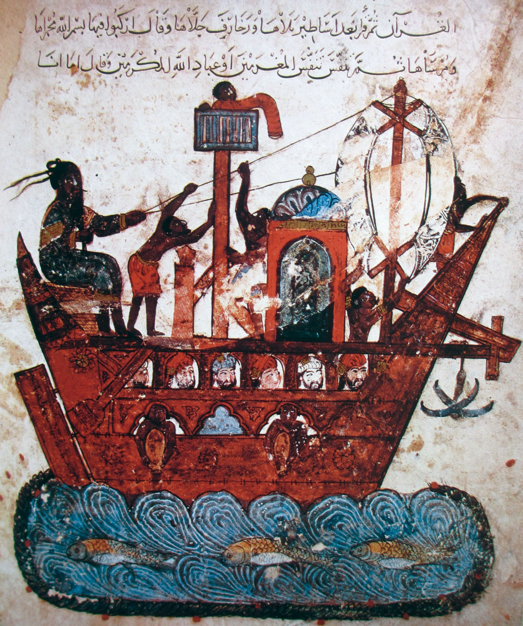 画上许多细节都是船史研究者极感兴趣的。船头悬着一个锚,不是通常的两爪锚,而是阿拉伯商船特有的多爪锚;船侧有“四分之一舵”,这是2000多年的传统,但在船尾部还有一个巨大的轴心舵。它表明至少12世纪的阿拉伯船已有了两种方向控制系统。这种船尾轴舵的使用,很可能来自中国,并通过阿拉伯人传给了北欧的柯克船。