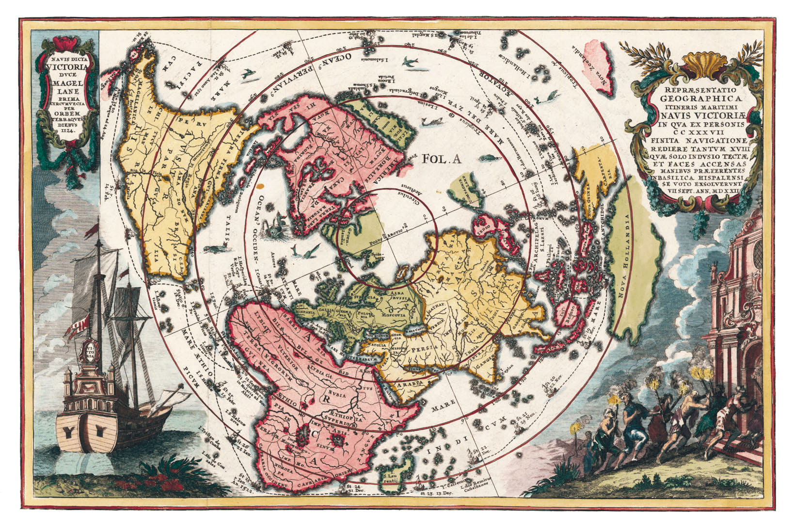 地图上写诗是极少见的,平添了一些人文趣味。当然,图中最重要的是新航海信息。此后一段时间内,麦哲伦环球航线都是全景化世界航海图描绘的热点,一直到1700年左右,耶稣会会士谢勒·海因里希(Scherer Heinrich)还绘制了一幅《从北极视角描绘麦哲伦环球航线图》。这是一个全新的环球航行视角,虽然南北方向的大陆与海洋被压扁了,但几块大陆的关系得以俯视,也是有趣的事。更有趣的是地图上的插图,左边描绘了唯一回到西班牙的维多利亚号,右边描绘了返回家园的18位幸存者怀着感恩的心情跑到塞维利亚教堂礼拜的场景。
