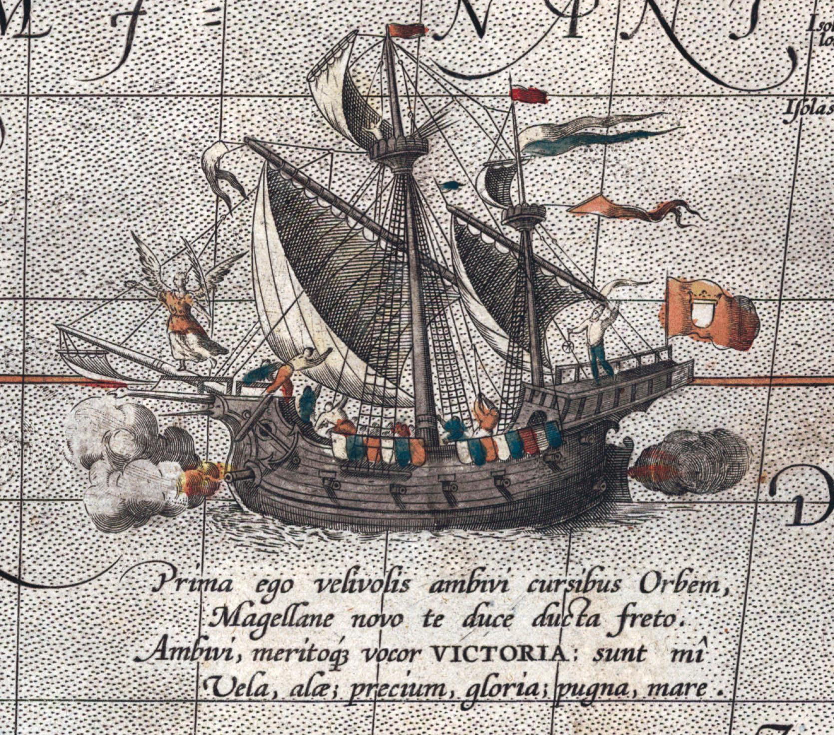 不过,亚伯拉罕·奥特里乌斯(Abraham Ortelius)1589年再次出版的《世界概观》(首版为1570年),收入了马里斯·帕奇菲奇(Maris Pacifici)1567年左右绘制的《太平洋地图》。此图为了向麦哲伦的伟大航行致敬,特意在太平洋中央画了一条船,前边还有个小天使为其领航,一群飞鱼跃到了船上。它就是唯一幸存下来的维多利亚号。在这艘伟大的船边,作者还刻了一首诗:
