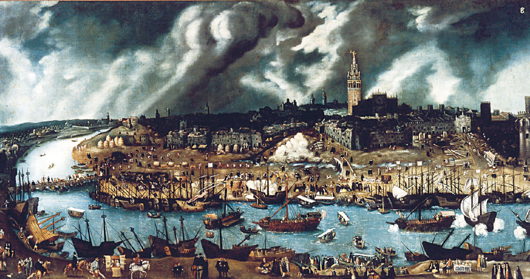 因为看了西班牙画家阿隆索·桑切斯·科洛(Alonso Sánchez Coello)大约绘于1576年间的《塞维利亚城瓜达尔基维尔河上的造船厂》,我到塞维利亚考察时,特别选在夕阳西下时去看仍然健在的黄金塔,一点一点走入16世纪后半叶瓜达尔基维尔河的画面。河中央加莱桨帆船还在像蜈蚣一样“爬行”,河岸已是一派热火朝天的造船工地,那艘斜躺在河边基本完成船壳的大船,和几艘已完成涂装的大船,都是西班牙当时最需要的大帆船——盖伦船。