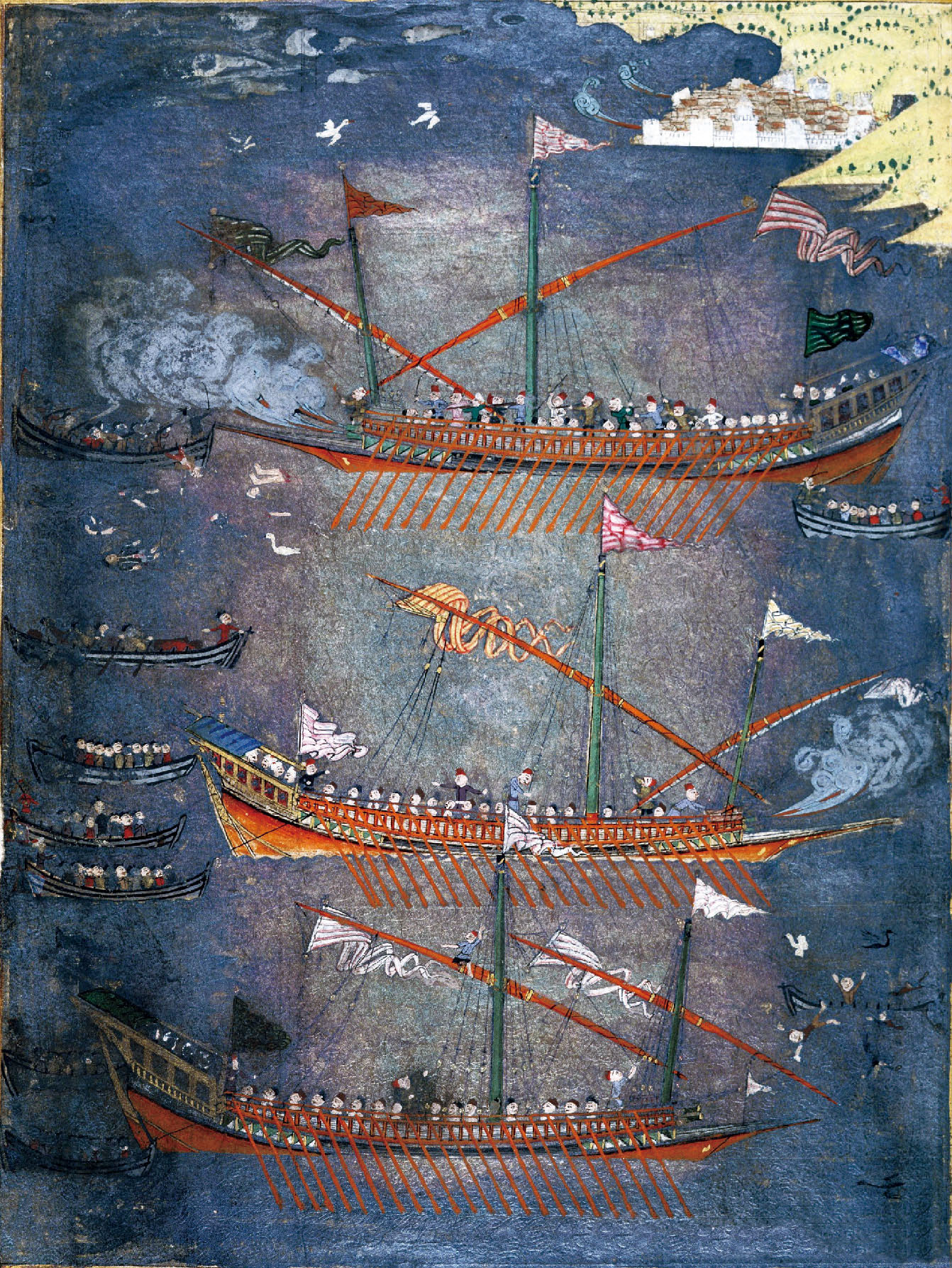奥斯曼帝国也排出了强劲阵容,其主力舰队的北端(右翼)由52艘排桨战船和6艘快速排桨船组成,舰队的南端(左翼)部署了63艘排桨战船和30艘快速排桨船,中央主力为61艘排桨战船和32艘快速排桨船,由米埃津札德·阿里帕夏(Pasha Ali Mouezinzade)亲自统领。此外,在中部主力舰队的后方,还部署了一支由8艘排桨战船、22艘快速排桨船和64艘弗斯特船组成的预备队。