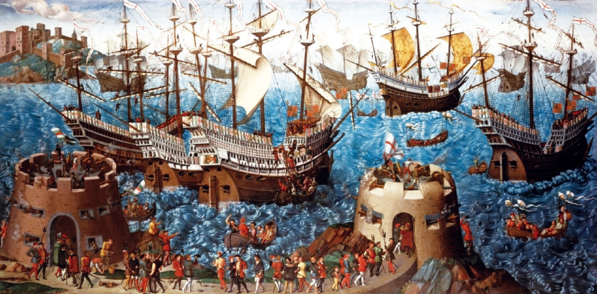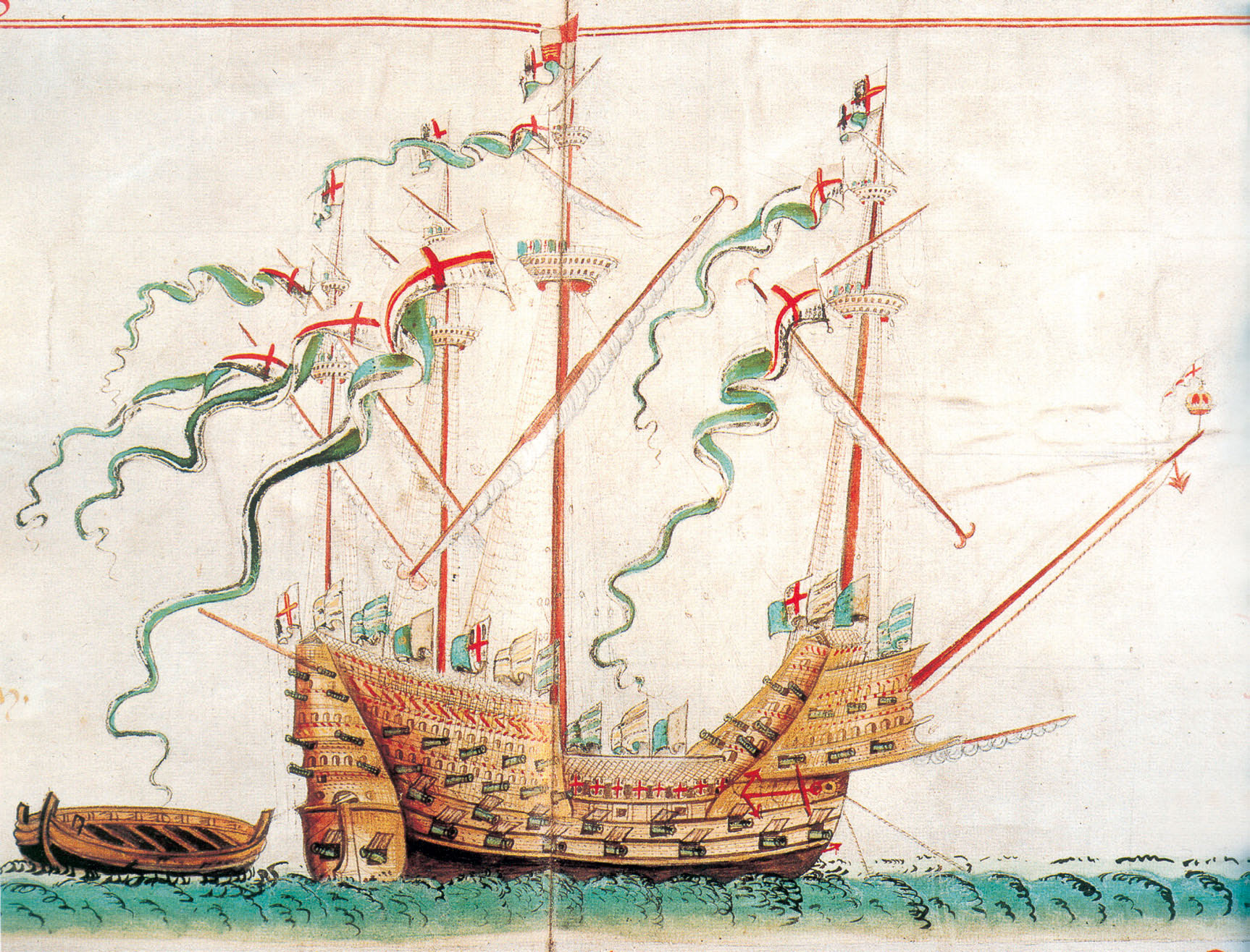 亨利八世在位期间,在扩充战船和改良战船上投入了巨大精力。这一点,人们可以从史诗性画作《1520年亨利八世国王在多佛尔港登船》中有所感悟。这幅画的作者詹姆士·巴塞尔(James Basire)的生平事迹没有留传,人们推断他大约生活在1520—1550年,此画大约绘于1545年,后由英国王室收藏。