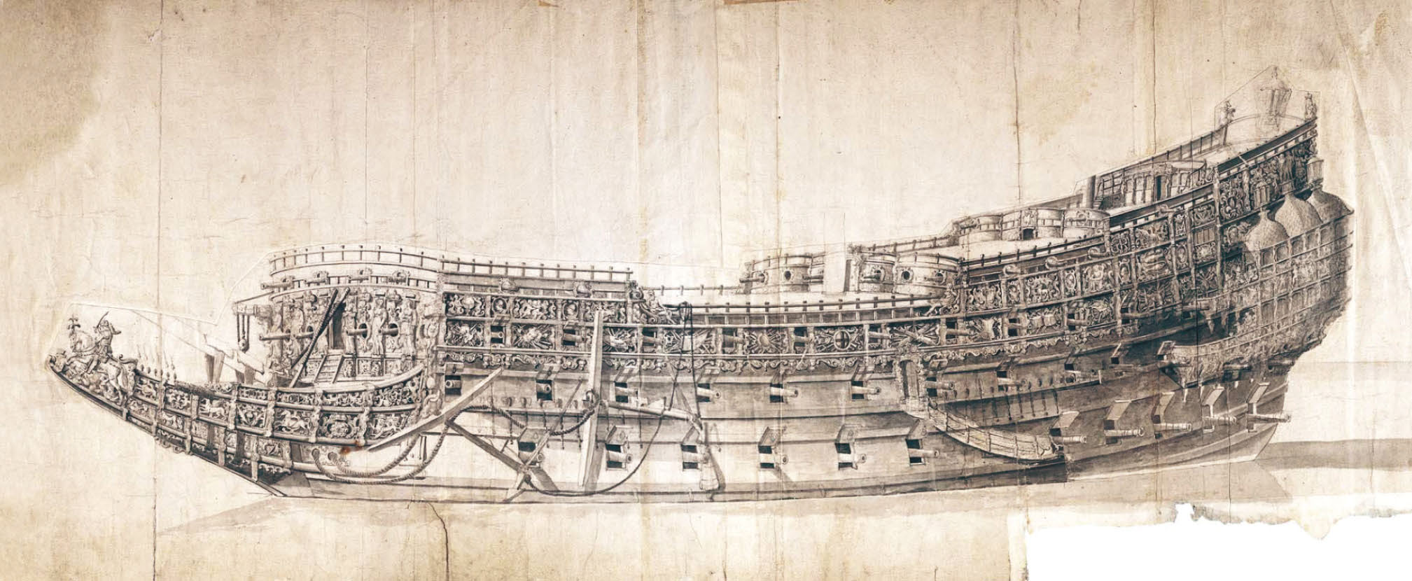 海洋主权号没留下设计图纸,存世的“准图纸”只有荷兰画家小威廉·德·维尔德大约在17世纪60年代绘制的“海洋主权号图纸”。它精细描绘了这艘超级战舰的侧面、三层甲板的火炮安排,以及船侧面的奢华装饰。