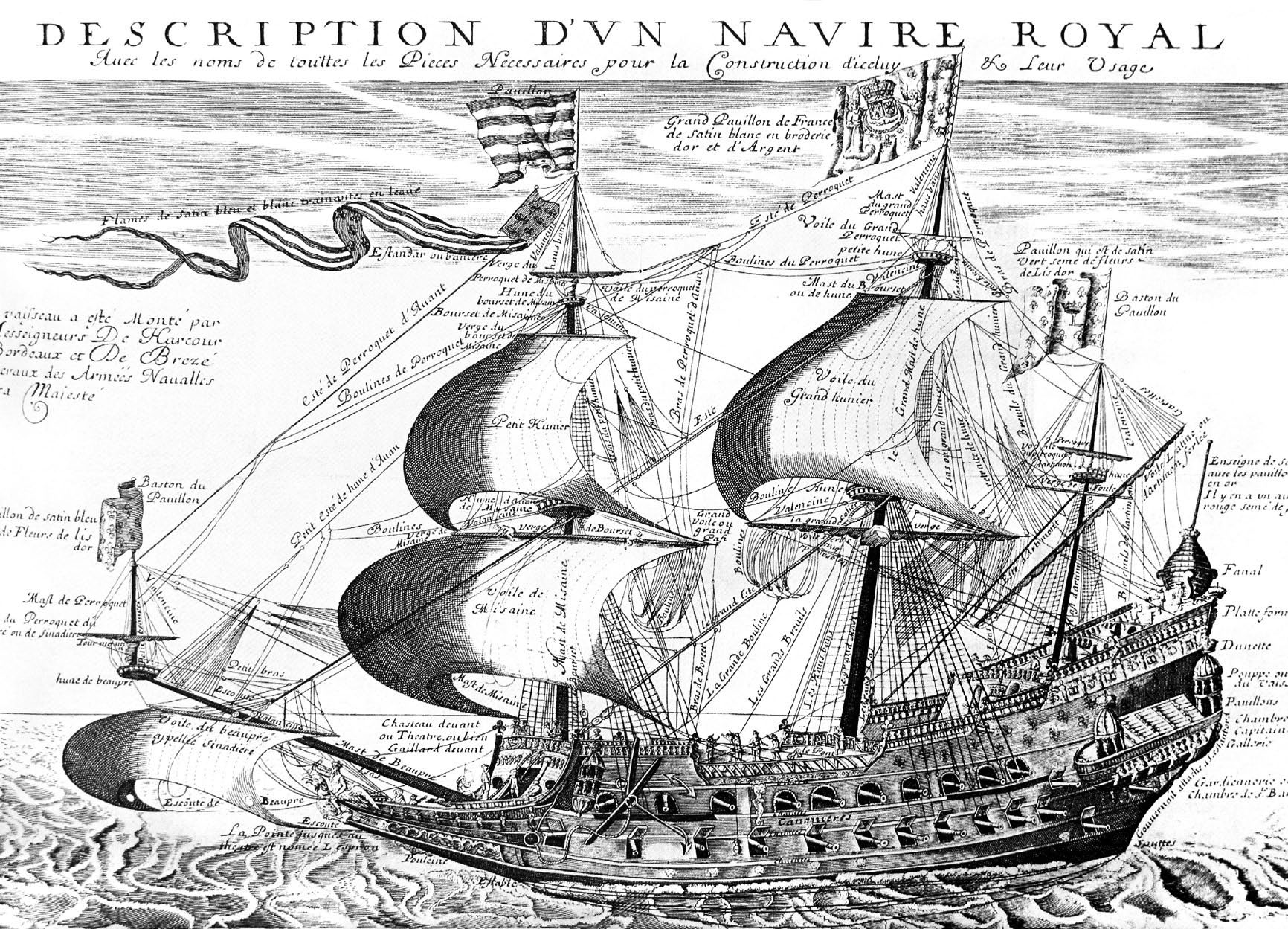保家卫国,需要战舰;开疆拓土,更需要战舰。不过,1627年国家船坞尚未建好时,法国只能在阿姆斯特丹请荷兰人先为法国建造排水量1000吨的准战列舰皇家号(La Royal)。它是法国文献中可以查到的最早的大型风帆战列舰,载炮52门,最大的炮为36磅,最小的炮为12磅,火炮分布在两层甲板和艏艉楼上。遗憾的是,这艘战舰到1649年退役时也没参加过一场海战。