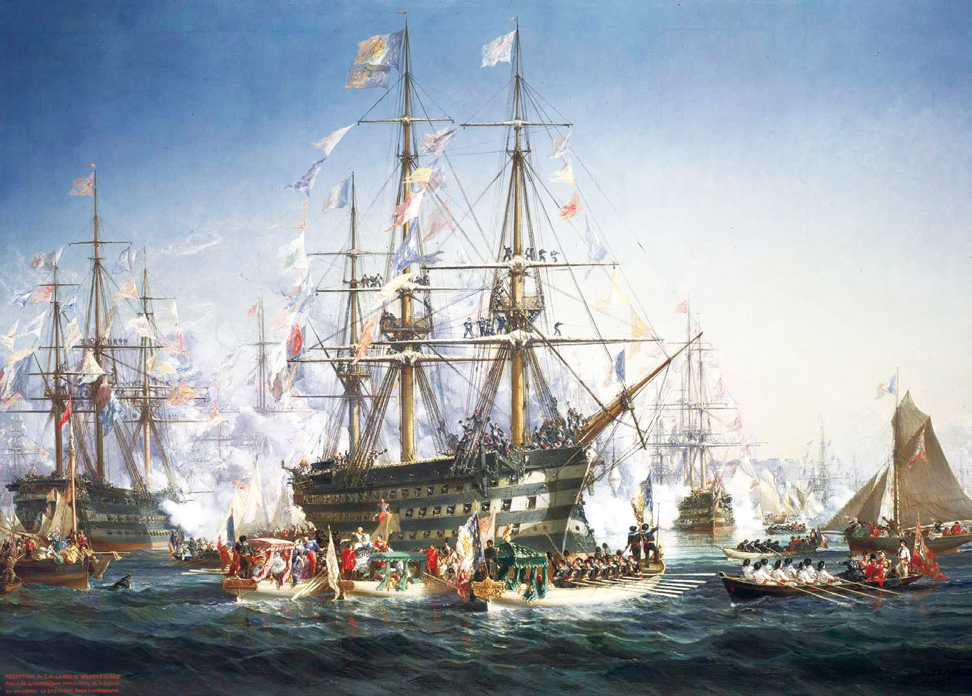 1858年8月5日,拿破仑三世和欧仁妮皇后先视察了法国西北部港口瑟堡,并在此迎接前来参观新开放的“拿破仑三世盆地”的英国维多利亚女王和阿尔伯特亲王。拿破仑三世身着法国海军上将军服,在位于瑟堡的旗舰布列塔尼号上组织了一个盛大的宴会接待女王和亲王。