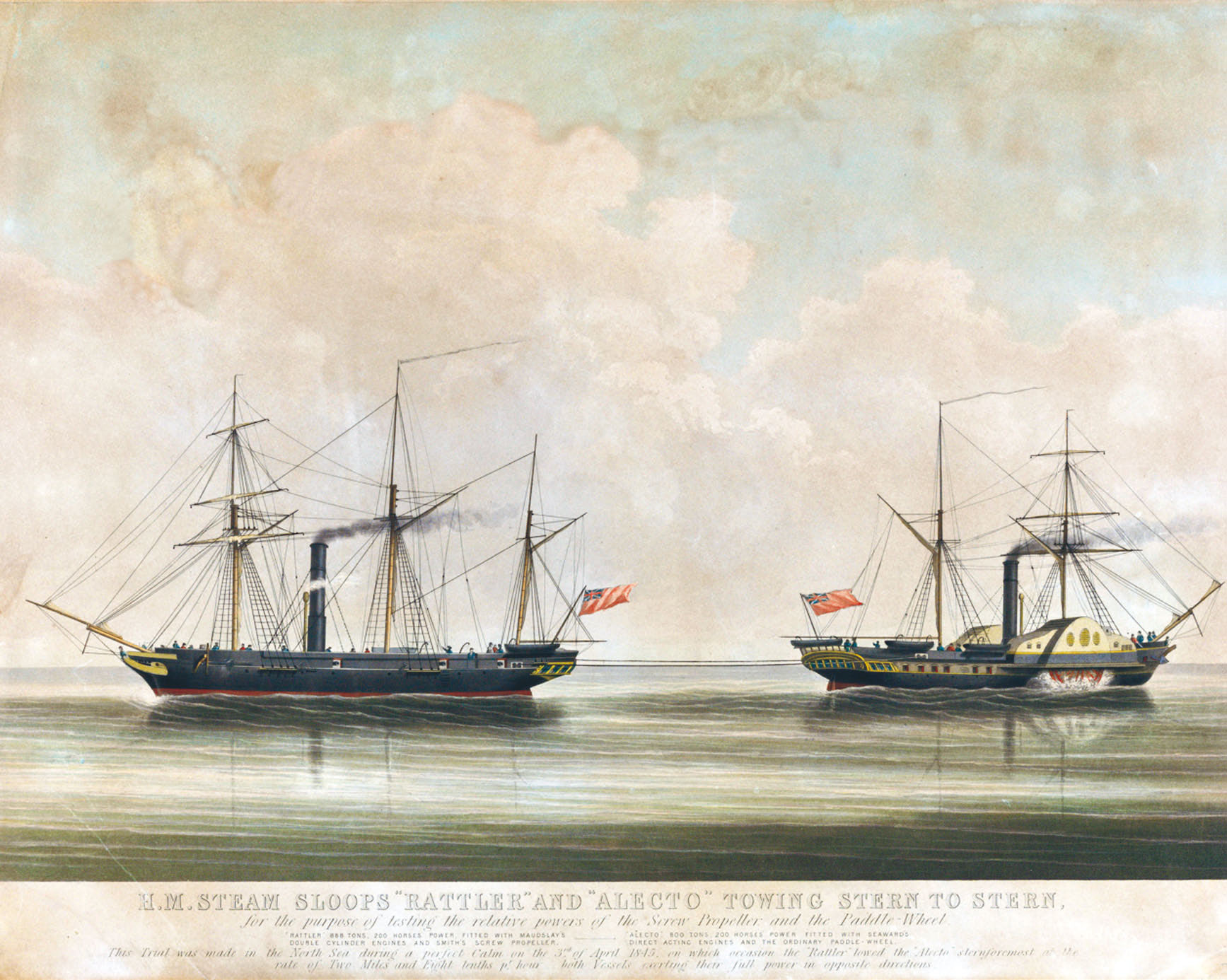 画面上,两条船的英国旗已飘往一个方向——螺旋桨汽船响尾蛇号逆着明轮汽船阿莱克托号的引擎方向,以2节(3.7千米/时)的速度将对手拖走。后来,双方又来了一次航速比赛,螺旋桨船再次完胜明轮汽船。