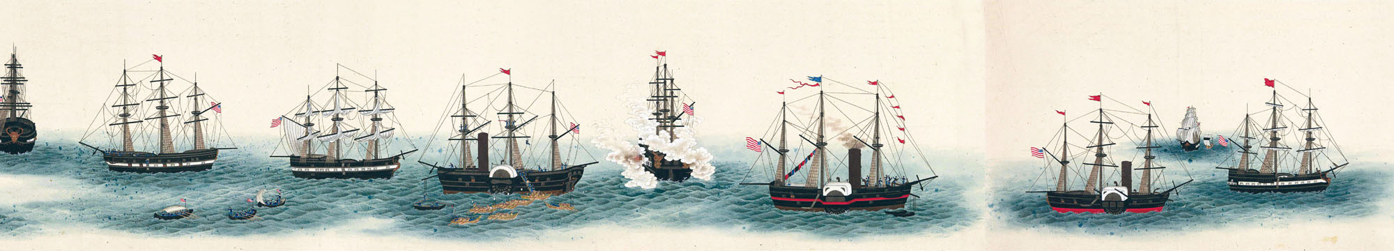 前些年,英国发现了反映第二次“黑船来航”的日本绘卷,此卷长15米,宽29厘米,用14个画幅详细描绘了美国海军准将马休·佩里1854年第二次率舰队来到日本签订通商条约的重要历史事件。我是通过苏格兰的朋友从大英博物馆购得此卷的高精电子版和使用权。这个绘卷形象地记录了1854年的日美谈判。