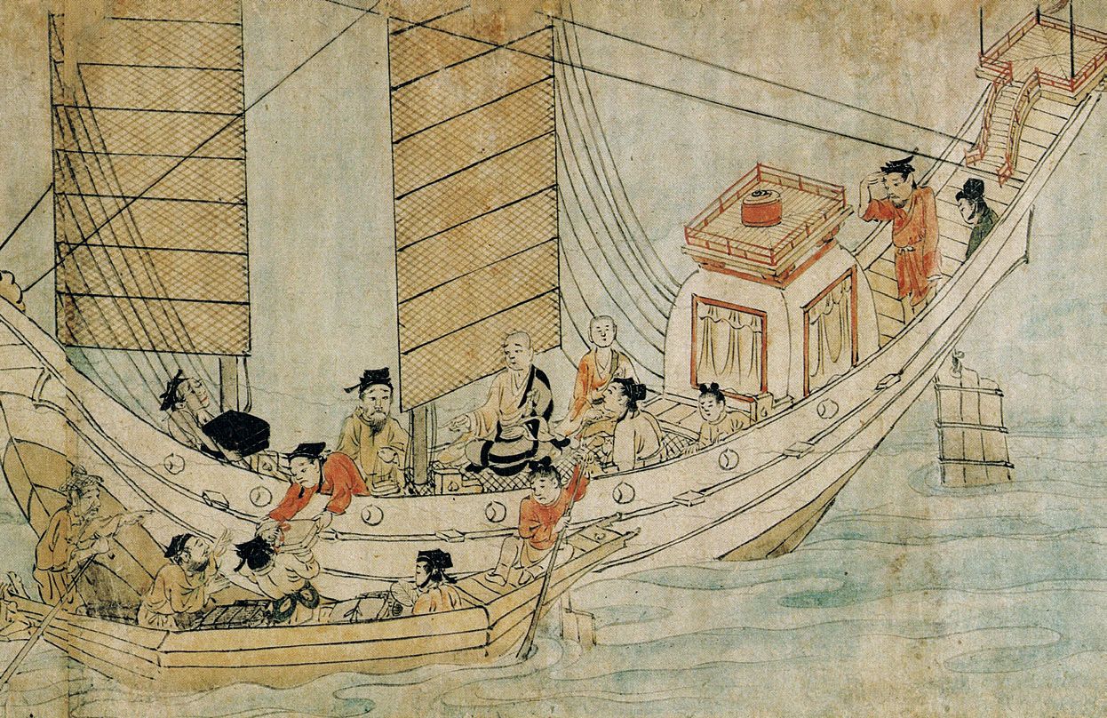 两件绘卷成书时间已是中国元朝,画中表现的是唐代故事,其中描绘的唐船应当借用的是宋船。两件绘卷中的船十分相近,都是两桅,席帆,方头,方尾,船头开角,船尾高高,图中还明确描绘了唐宋船采用斜穿铁钉的平接技术。这种船多制造于江浙沿海,是唐宋时期黄海海上交往的重要船型,也是海上丝绸之路的重要史料。