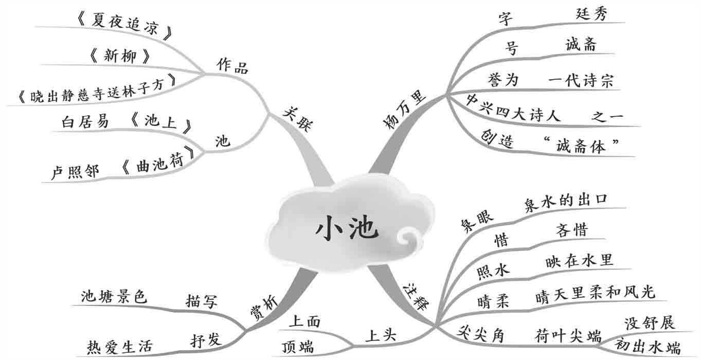 这是一首描写初夏池塘美丽景色的小诗。全诗紧扣“小”字,池是小池,泉是细流,荷是小荷,一切都是小巧玲珑的,描绘了一幅生动又充满生活情趣小池风景图,表现了大自然万物之间亲密和谐的关系,充满了生活情趣,抒发了作者热爱生活之情。