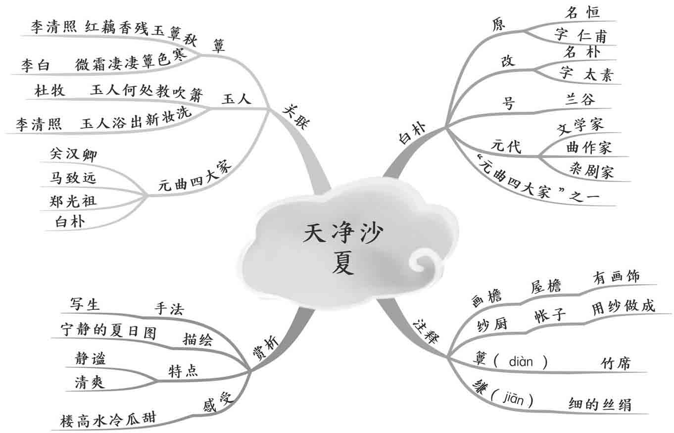 云销雨霁,水面增高并增添了波澜,远处高楼显得比平时更高了,水让人感觉到比平时更凉爽了,雨后的瓜也似乎显得比平时更甜了,绿树的树荫一直遮到屋檐。纱帐中的藤席上,芳龄女孩身着轻绢夏衣,手执罗扇,静静地享受着宜人的夏日时光。