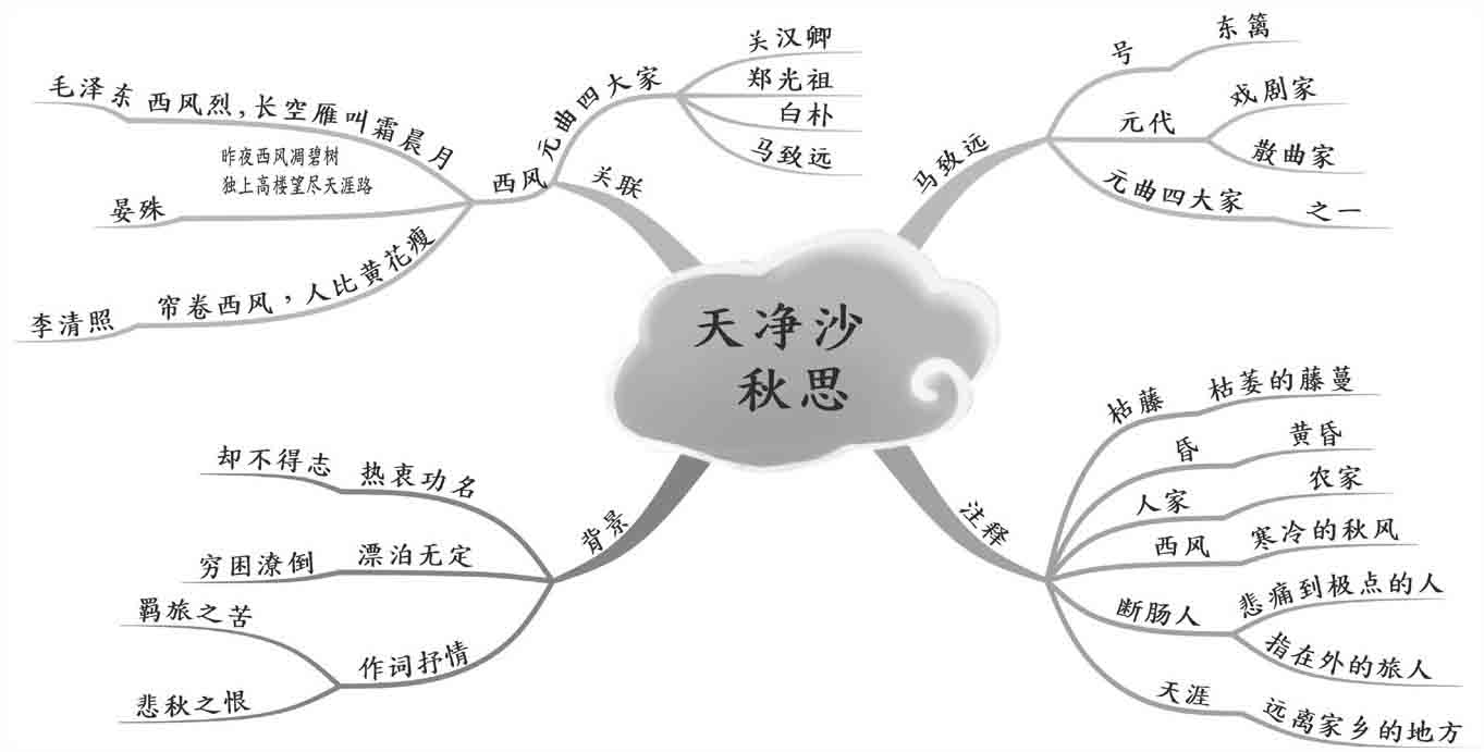 马致远年轻时热衷功名,却一直未能得志。再加上他几乎一生都过着漂泊无定、穷困潦倒的生活,于是在独自漂泊的羁旅途中,写下了这首《天净沙·秋思》,抒发了一个飘零天涯的游子在秋天思念故乡、倦于漂泊的凄苦愁楚之情。