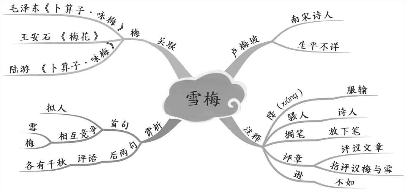 诗的前两句采用拟人的修辞手法,写梅雪争春,要诗人评判。梅花与雪花相互竞争,都认为自己是最具早春特色的,而且互不认输,诗人也难于评判,只好停下笔来思索。两句诗便将早春的梅花与雪花之美别出心裁、生动活泼地表现出来了。后两句是诗人对梅与雪的评语。就洁白而言,梅比雪要差一些,但是雪却没有梅花的香味。梅和雪各有千秋。将梅与雪的不同特点用两句诗概括了出来,写得妙趣横生。
