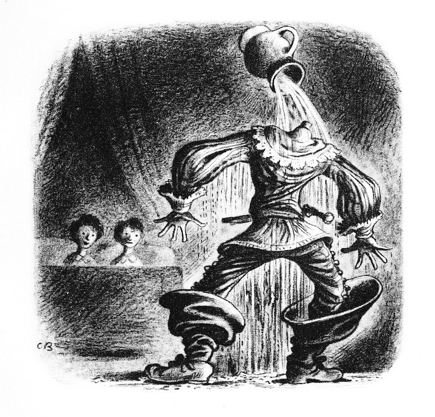 首先,他当然得坐在他们的胸口上,好让他们有种身陷噩梦、喘不过气来的感觉。接着,既然兄弟俩的床挨得那么近,那么他会站在两张床之间,扮作一具绿色的冰冷尸体,直到兄弟俩吓得动弹不得。最后,他会揭掉身上的裹尸布,白骨森森、单眼上翻地在房间里爬来爬去——这个角色叫作“哑巴丹尼尔”,又名“自杀的骷髅”,他曾靠此角色不止一次取得极佳的演出效果。在他的心目中,这个角色即使与他的著名扮相“疯子马丁”,又名“蒙面怪客”相比也毫不逊色。
