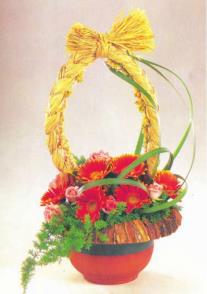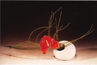 金雀儿花花枝柔韧易塑,可作弯曲扭卷,剪去上段枝茎,修疏过密枝条,三五条随意捆扎,使其向不同空间伸展,带出一份天真童趣。一片红掌伸出花器外作焦点,与深厚圆滑的花器形成红白对比,使作品得以均衡。您是否看到小童开心的红扑扑的脸?