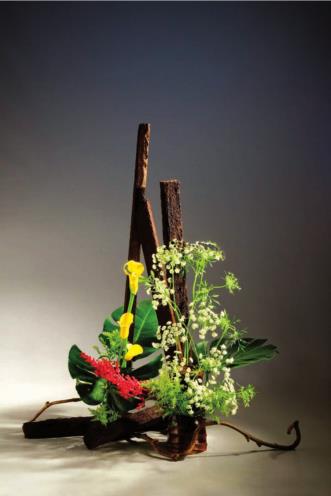 拣拾废弃堆中的蛇木作为花艺创作时的创意架构,搭配海芋、观赏菠萝、蕾丝花,于是鲜活的造型创作出现了。大地万物都是同体共生,珍惜树木资源,一用再用,都可以成为美好的花艺作品。枯木逢春,化腐朽为神奇,何尝不是生命的礼赞呢?