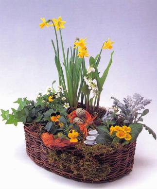 花材:水仙、报春花、三色堇、银叶菊、常春藤、鹌鹑蛋