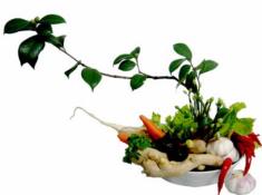 花材:姜、蒜头、辣椒、白萝卜、胡萝卜、芹菜、荸荠、韭菜花、香菜、生菜、茶花