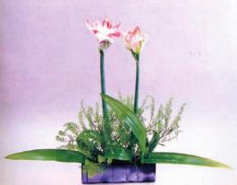 朱顶兰盛开在春季。特点是独葶,花葶粗壮挺立。插花时为了突出其挺立的特点,下部的叶片尽量低插,用素色的珍珠草作陪衬,使两枝花高高在上,像两个花季少女,亭亭玉立,楚楚动人。