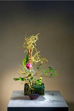 花材:桑、蒲葵花、蒲葵叶、芍药、浮萍、河骨、蓝星花、鸢尾、一叶兰