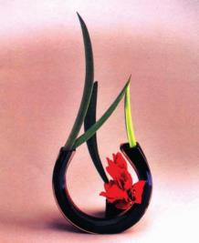 这是一个点线结合的造型花。红色的焦点,恰如女孩红扑扑的脸,扭曲的叶片顺花器的圆弧线延伸、舞动,给人以无限的遐想……此花置于卧室,流畅而热烈。