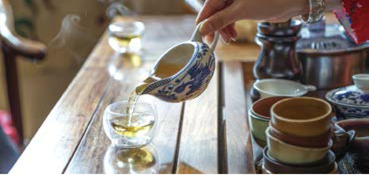 想再随性一些,只需放上两把摇椅,几个茶杯,一个简陋的茶席就出现在眼前。一撮茶,一把壶,把尖细的茶叶泡成花瓣的形状,心情也渐渐舒展开来,繁忙都被抛在脑后,让太阳沿着茶室窗户一直晒到脚踝边,静下心来闻,是冷冬的香味、枯叶的香味、泥土的香味,还有清茶的味道。