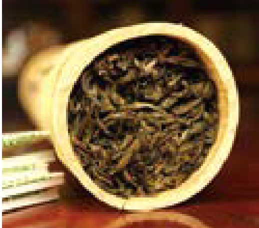装茶 将采摘细嫩、再经初加工而成的毛茶,放在嫩香竹筒中,分层陆续装实。